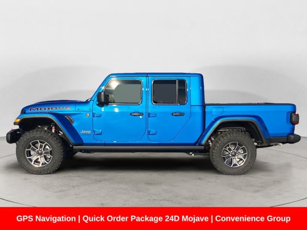 Blue Pearl 2026 Jeep Gladiator Mojave 4WD 8-Speed Automatic 3.6L V6 24V VVT Alloy wheels, Alpine Premium Audio System, Apple CarPlay/Android Auto, Auto-Dimming Rear-View Mirror, Automatic temperature control, Body Color 3-Piece Hard Top, Body Color Rubicon Highline Flare, Convenience Group, Delay-off headlights, Freedom Panel Storage Bag, Front Bucket Seats, Front dual zone A/C, Front fog lights, Fully automatic headlights, GPS Navigation, HD Radio, Heated Front Seats, Heated Steering Wheel, Integrated Off-Road Camera, Quick Order Package 24D Mojave, Rear Sliding Window, Rear Window Defroster, Remote keyless entry, Remote Start System, Technology Group, Universal Garage Door Opener, Wheels: 17" x 7.5" Dark Gray Painted.